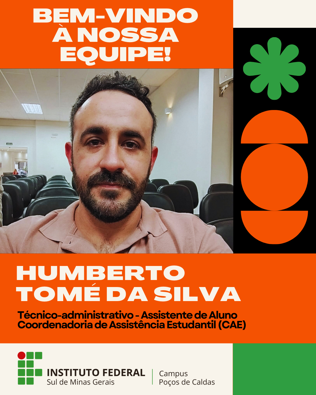 Humberto Tomé da Silva – Assistente de Alunos, lotado na Coordenadoria de Assistência Estudantil (CAE);
