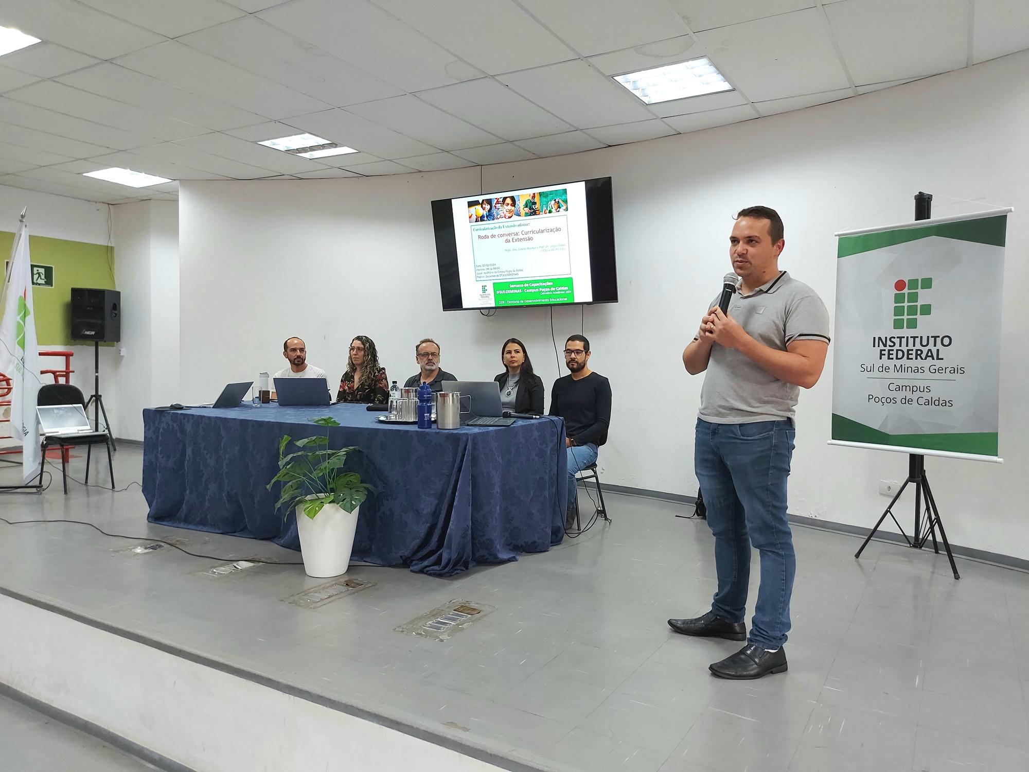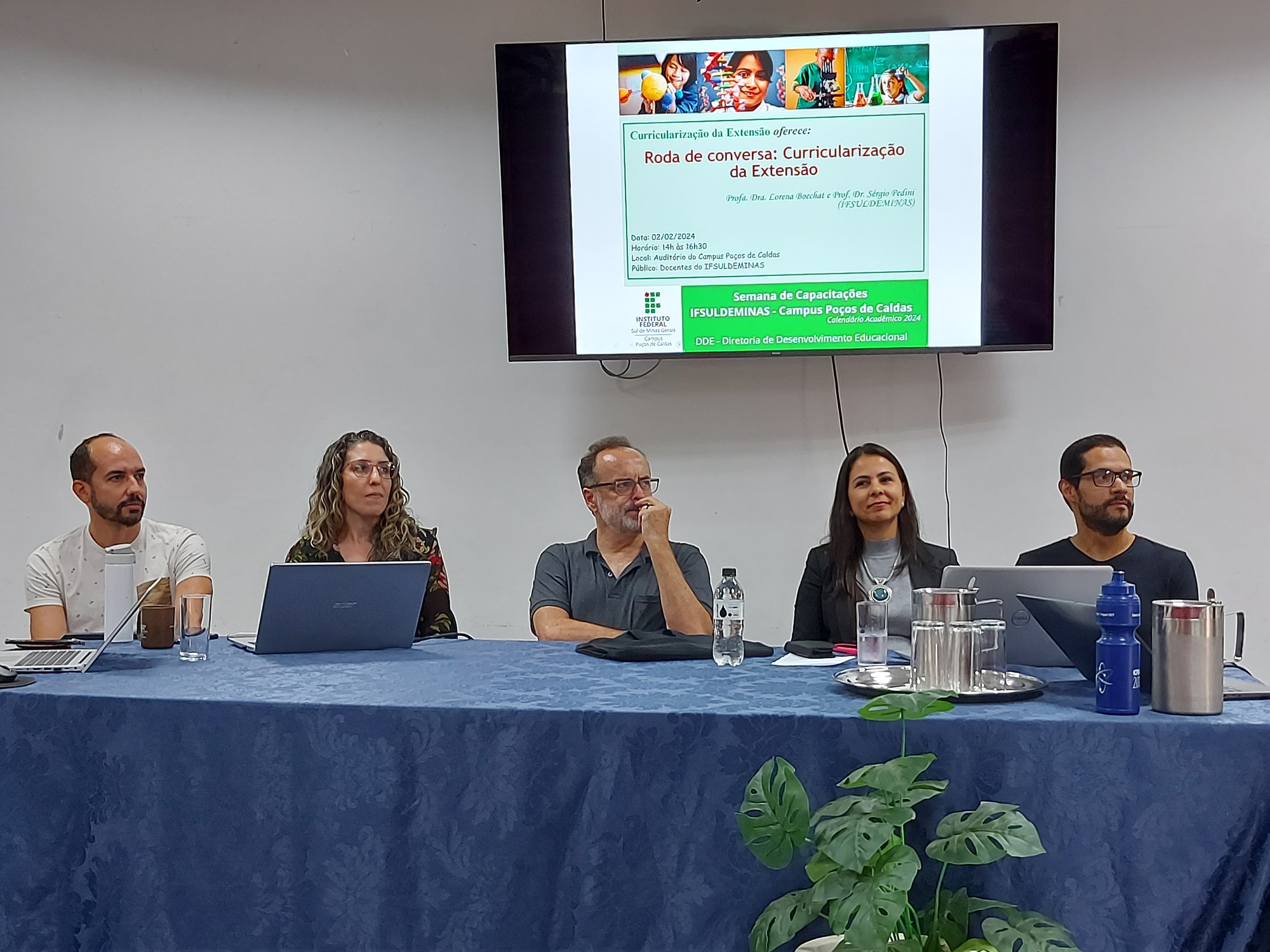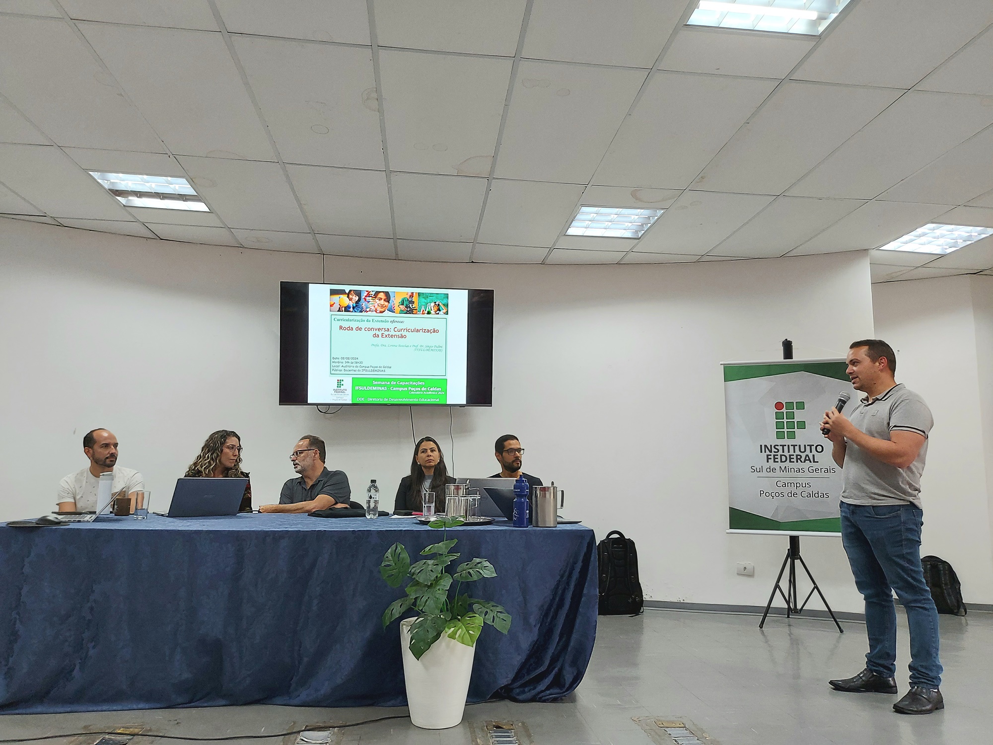 A roda de conversa “Curricularização da Extensão” encerrou a Semana de Capacitações do IFSULDEMINAS – Campus Poços de Caldas, nesta sexta-feira (02/02). O momento teve a participação dos professores Sergio Pedini, Lorena Boechat e André Roberto da Silva, e dos representantes da Pró-reitoria de Extensão do IFSULDEMINAS, a Diretora de Extensão Michelle da Silva Marques, e o Coordenador de Projetos e Eventos, Nildo Batista.