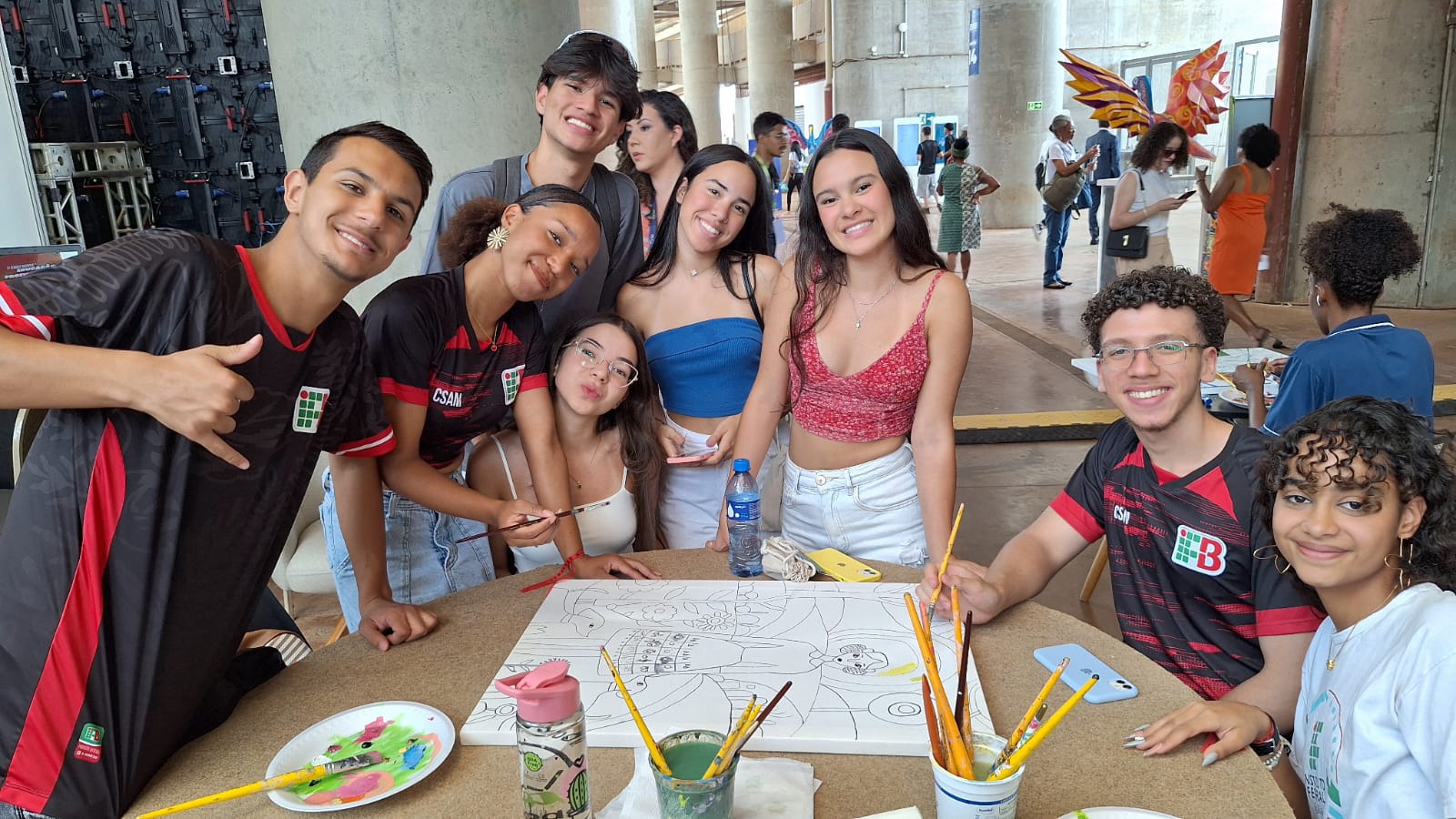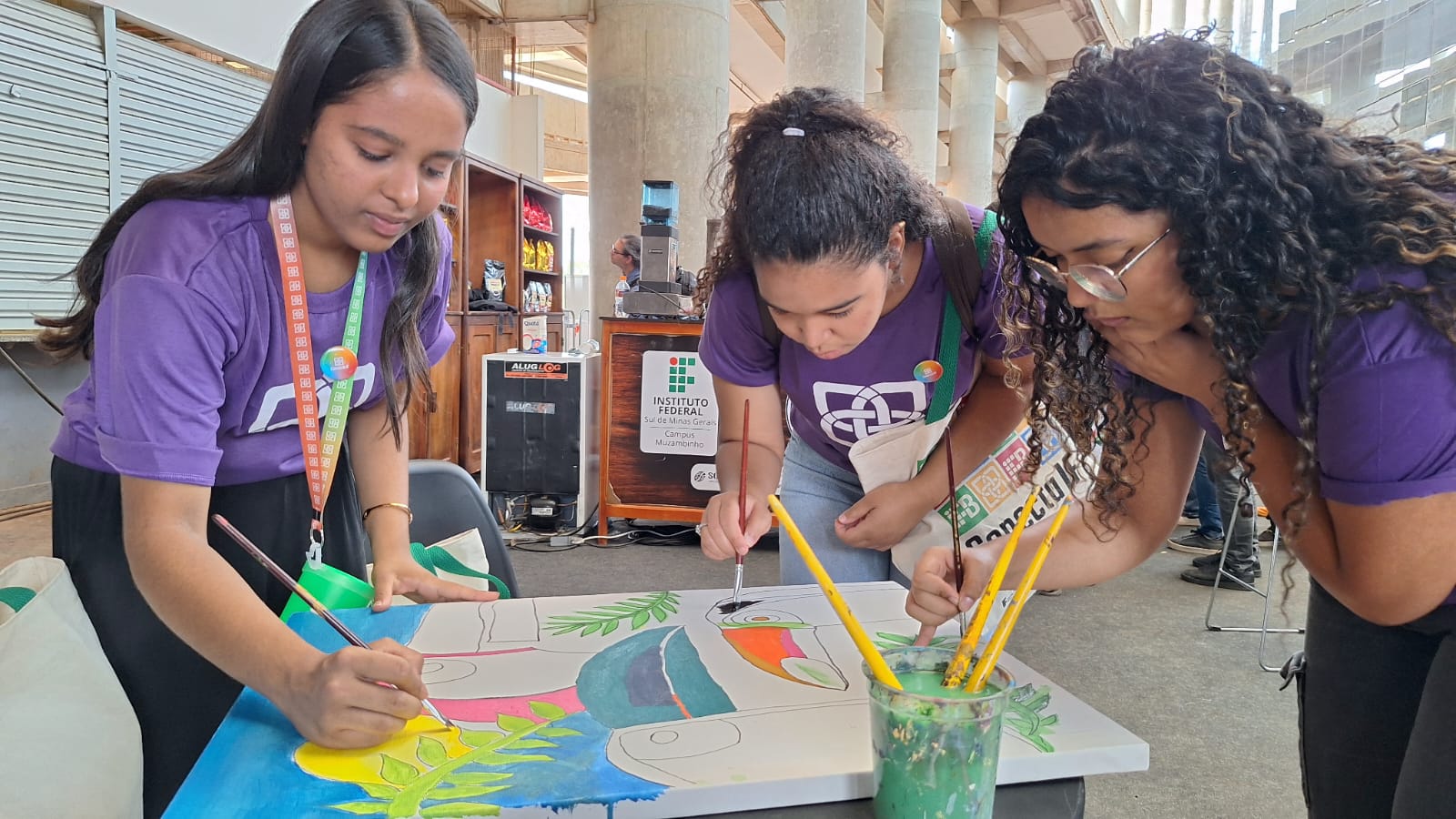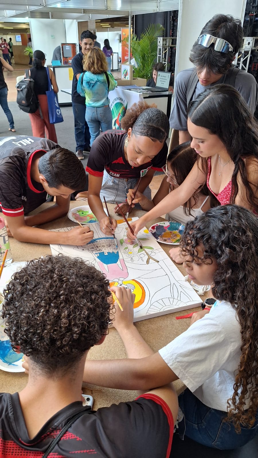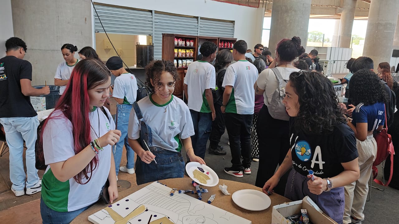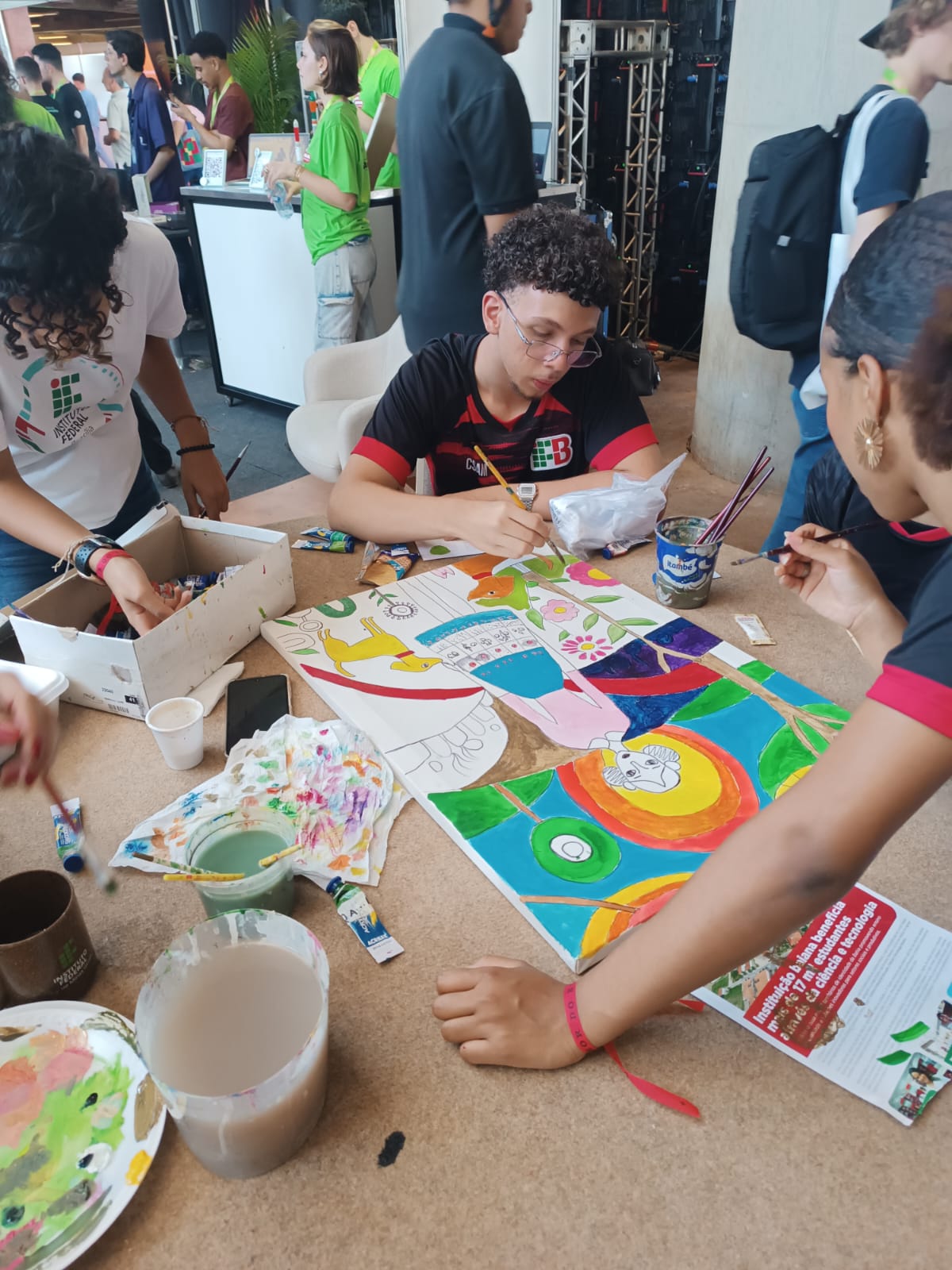 Com uma delegação formada por mais de 50 participantes, entre alunos e servidores, o campus brilhou com o projeto Pintura Coletiva, desenvolvido pelo Laboratório VOA. A proposta levou arte, cor e interação ao público, que pôde expressar sua criatividade ao participar da confecção de sete telas colaborativas, posteriormente sorteadas entre os visitantes que deixaram sua marca no estande.