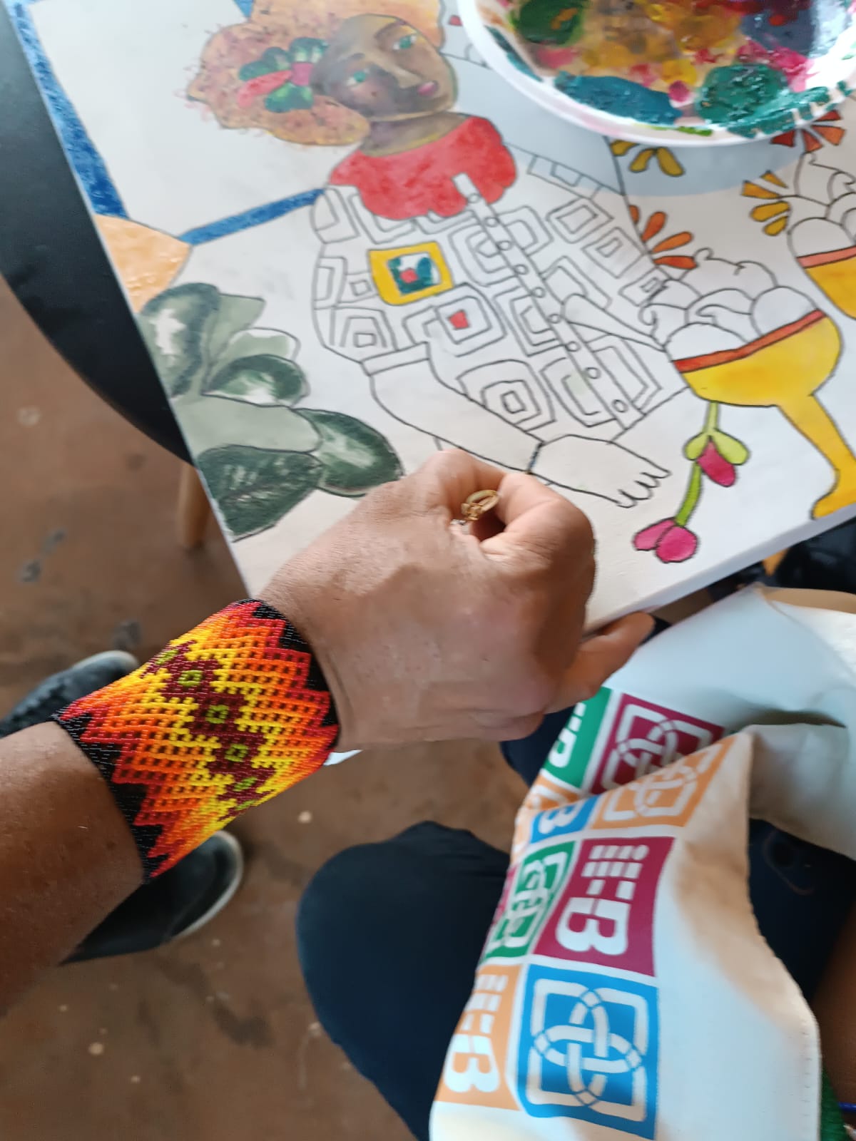 Prof. Márcio Bess acompanhandos os alunos na oficina de pintura